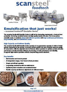 scansteel foodtech manufactures machinery and equipment as well as complete processing lines and solutions for the Global Food Processing Industry, Pet Food Industry and Processed Cheese Industry. Feel free to download our latest catalogues or please contact us if you have any questions.